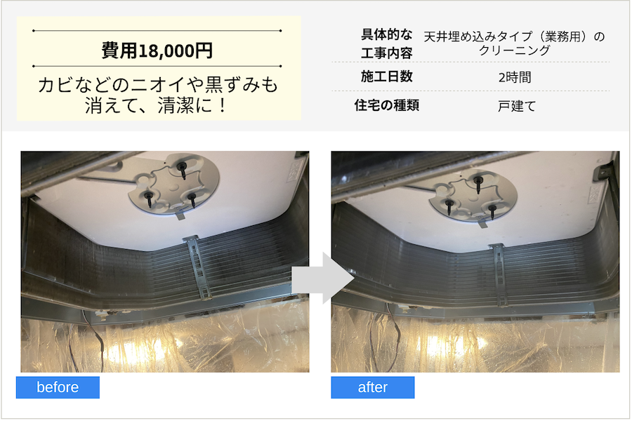 カビが気になり、ニオイも感じていた天井埋め込みタイプのエアコンをクリーニング。黒ずみがあたところもさっぱりキレイになりました。