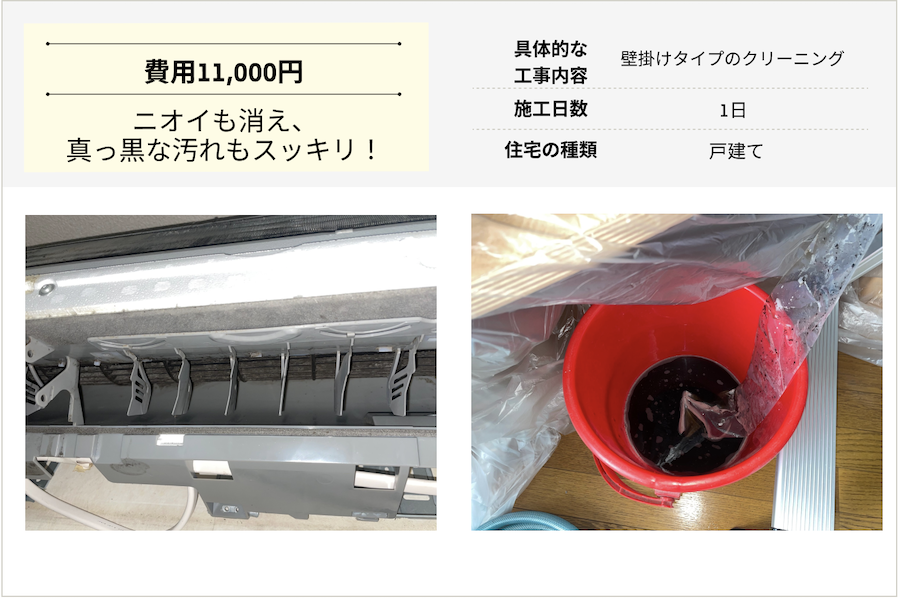 作業時間も短縮しつつ、壁掛けタイプのクリーニングを。真っ黒な汚れもすっきりキレイになり、気になるニオイも解消できました。