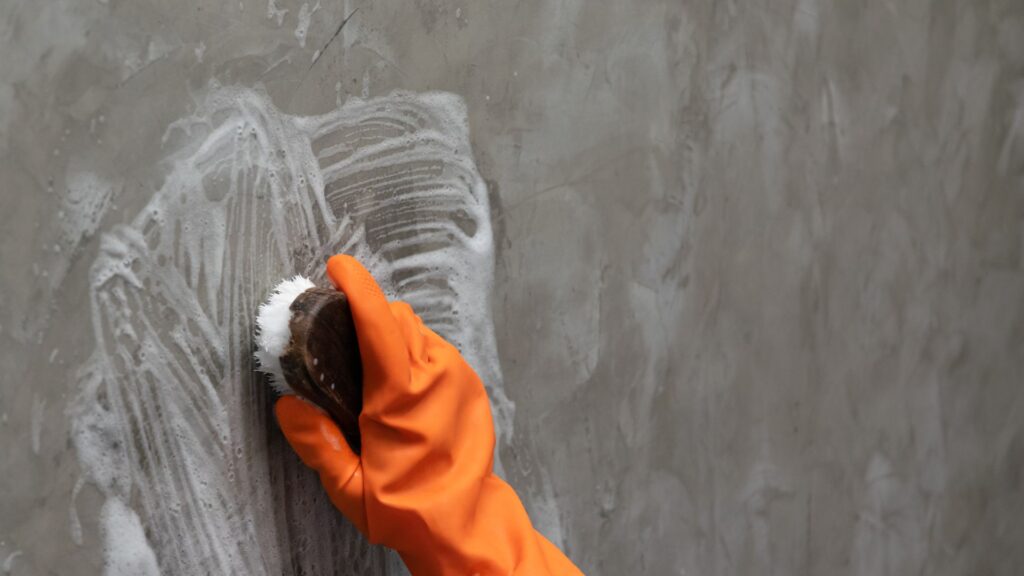 スプレーを散布してから4日ほど経過したら、外壁を水で綺麗に洗浄します。汚れが残っている場合は、ブラシやモップでやさしく丁寧にこすって落とすようにしましょう。