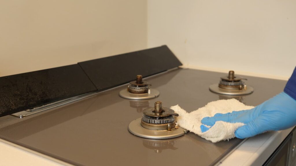 ガスコンロを一度移動させ、コンロの下、壁などに、洗剤をかけて雑巾やキッチンペーパーなどで綺麗に拭き取ります。