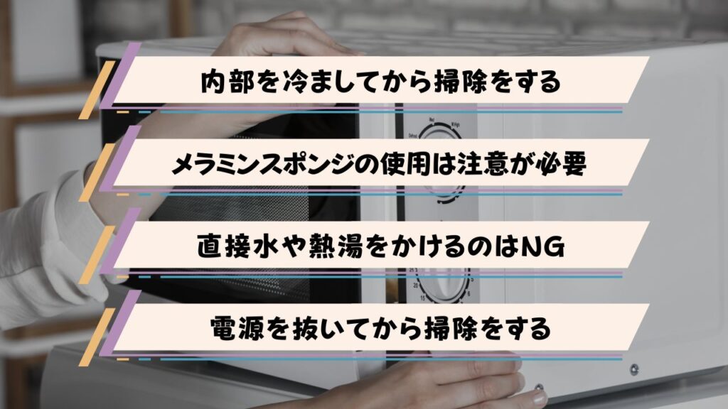 電子レンジは使用直後は高温になっているため、火傷の危険性があります。必ず内部が冷めてから掃除を始めましょう。焦って掃除を始めると、やけどをしてしまう恐れがあります。