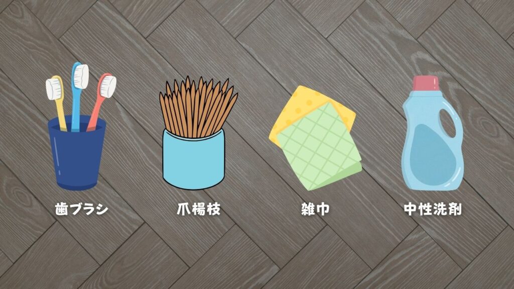 中性洗剤を水で薄めて古歯ブラシにつけ、フローリングの溝をブラッシングします。固めのブラシはフローリング表面が傷つくため、柔らかめのブラシでやさしく擦りましょう。