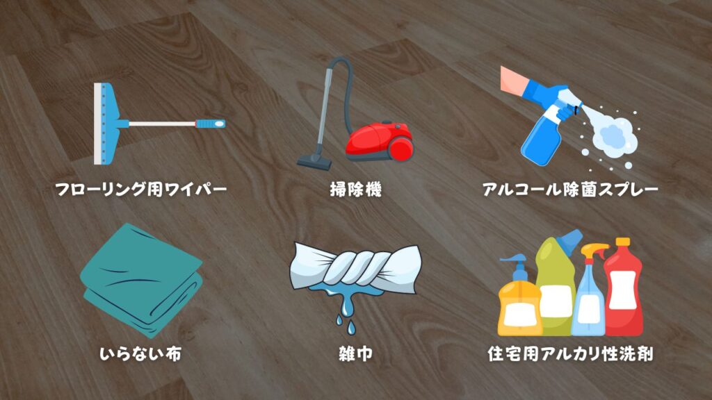 フローリングの黒ずみ汚れの掃除に必要なアイテムと手順を紹介します。