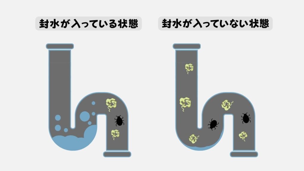 排水トラップには封水という仕組みがあり、水を貯めておくことで水が蓋の役割を果たし、下水からの臭いや虫の侵入を防いでいます。この封水が十分に入っていないと、下水の臭いが直接上がってきてしまうので注意が必要です。