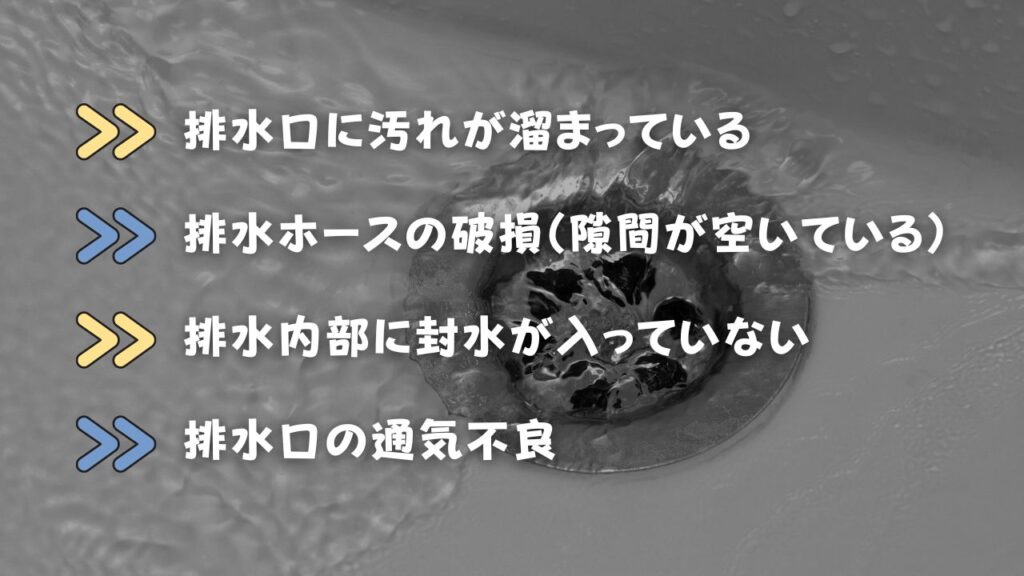 たとえば排水パイプが詰まっていたり、配水管とのつなぎ目が破損していたりする場合、通気不良によって下水の臭いが逆流することがあります。