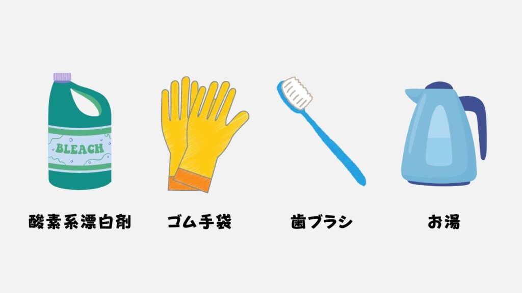 風呂場の排水口の臭いを消すには、酸素系漂白剤を使用しましょう。以下の道具と手順を参考にしてください。