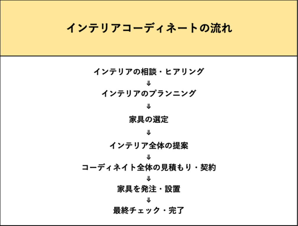 ここからは、インテリアコーディネートを依頼するときの流れについて説明していきます。個人や企業によって流れは異なるため、依頼する際は前もって確認しておくようにしましょう。