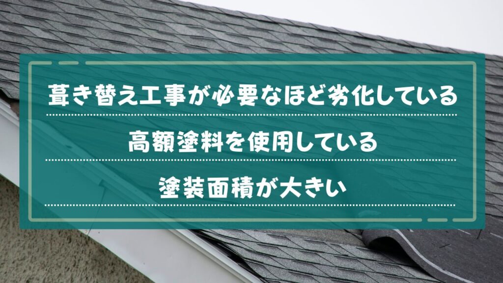 屋根の塗装・塗り替え工事は、建物の状況や条件によって費用が大きく変動します。特に以下の3つのケースでは、相場よりも高額になりがちです。