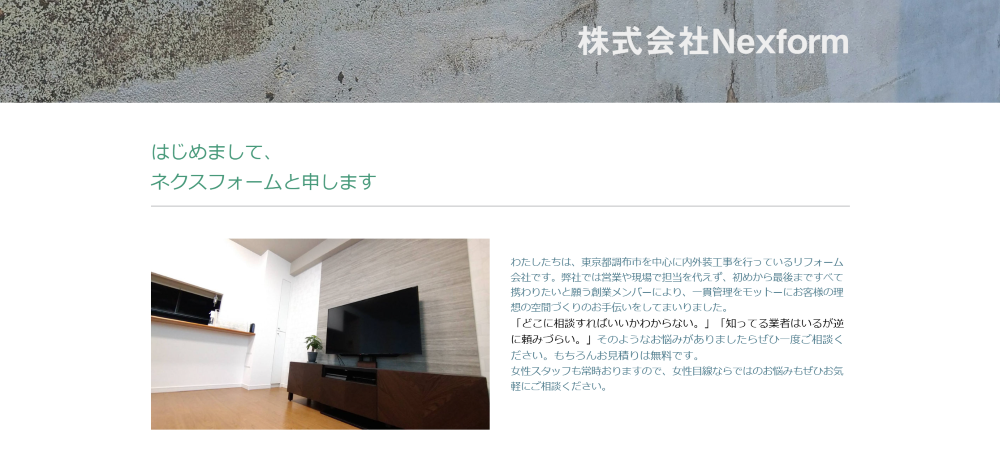 株式会社Nexformは東京都調布市を中心に幅広いリフォーム工事を手掛けるプロフェッショナル。。施工前のヒアリングから施工後まで一貫して対応するので、お客様の要望に柔軟に対応できるのが魅力です。内装リフォームに加えて、外装工事の施工も行っているので、庭の敷地を活用してリビングを増築するという依頼にも対応してもらえるでしょう。リビングスタイリストやインテリアコーディネーターなど住空間の改善に特化した資格も保有しているので、リビングに関するお悩みがあれば一度相談してみてはいかがでしょうか。