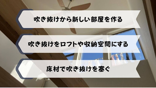 • 吹き抜けを塞ぐ方法は「新しい部屋を作る」「床材で吹き抜けを塞ぐ」「ロフトや収納空間にする」の3種類
