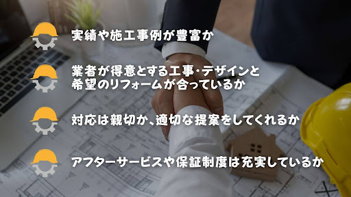 リフォーム業者選びは、リフォームの成功を左右するため慎重に行う必要があります。業者を選ぶ際は、コンセプトや料金プラン、サービスや施工事例などを入念に確認して検討しましょう。特に、以下の4つのポイントが重要です。