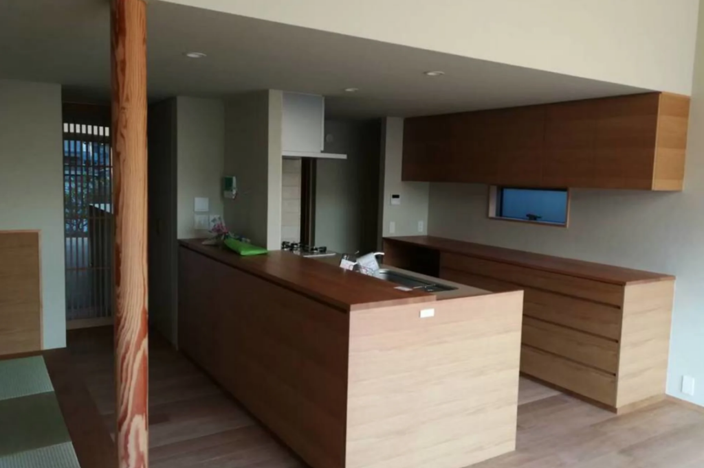 中古物件のリノベーションを行いました。特にキッチンにこだわりたいという要望を受け、既製品ではなく自社制作で造り付けキッチンを施工しました。
