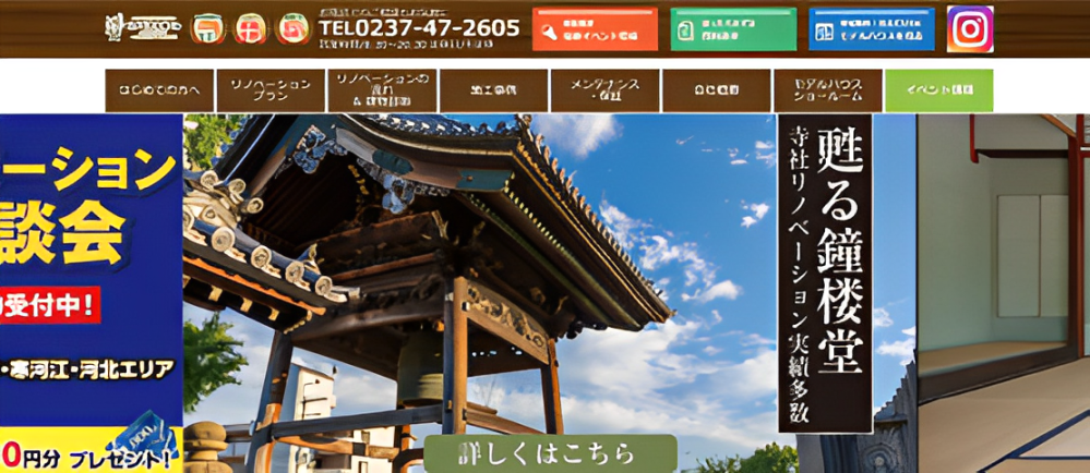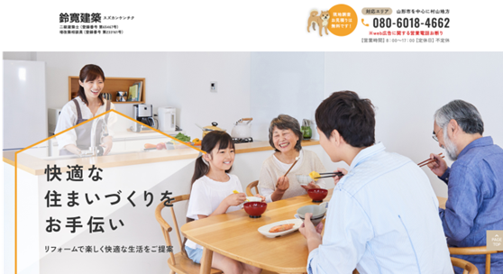 山形市を中心に展開する工務店で、水回りリフォームや内装リフォームなど幅広い施工に対応可能です。最近ではペットリフォームも行っており、動物と長く暮らせる住まいを提案しています。