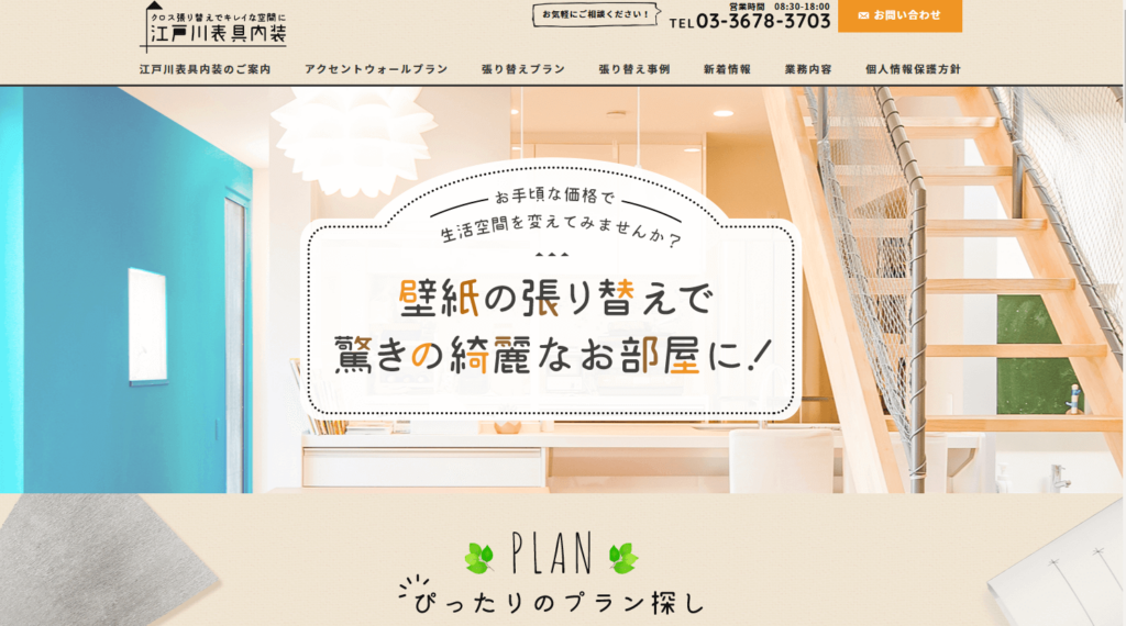 東京都江戸川区に拠点を構える事業者で、特にクロス張り替えやフローリングリフォームを得意としています。和室から洋室へのクロス張り替えにも対応しており、築年数の古さや柱・天井の汚れを利用して味のある空間に仕上げます。