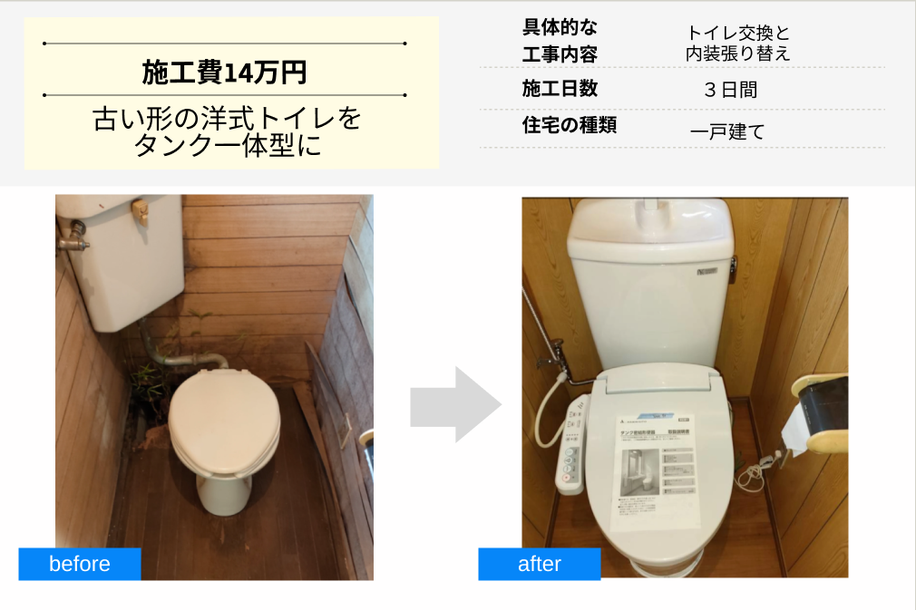 施工費14万円のトイレリフォームでは、古い形の洋式トイレを新しい形のタンク一体型トイレに交換しました。経年劣化したトイレ内部の壁も張り替えることで、すっかり新しい雰囲気になり、快適になったとお客様に喜ばれています。