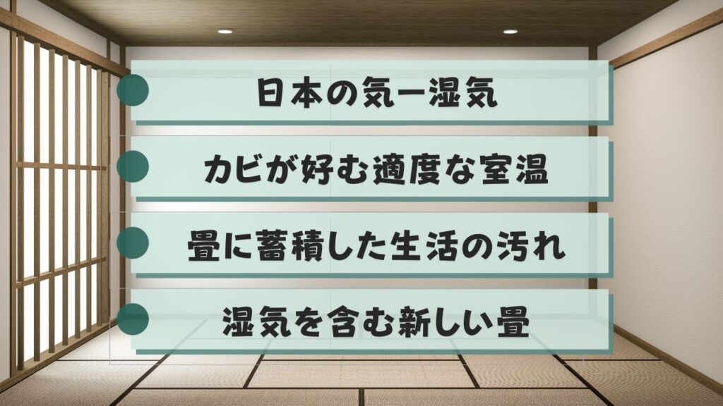 畳にカビが生えてしまう原因は、下記の項目が当てはまります。