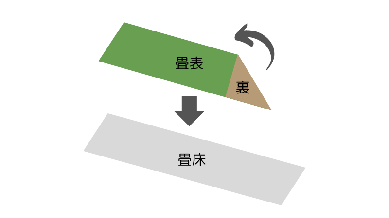 裏返しとは、現在使用している畳表を取り外し、裏面を利用する方法です。畳表のゴザの部分は両面使えるため、一度はがし、裏返して固定すれば表面を新品に近い状態に戻すことができます。