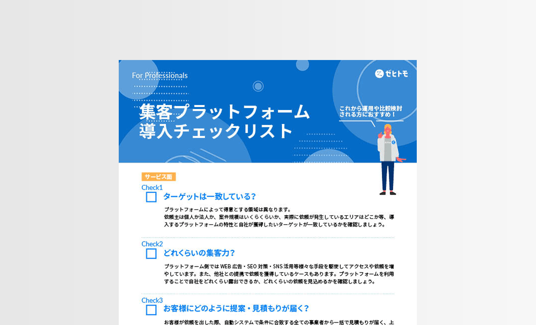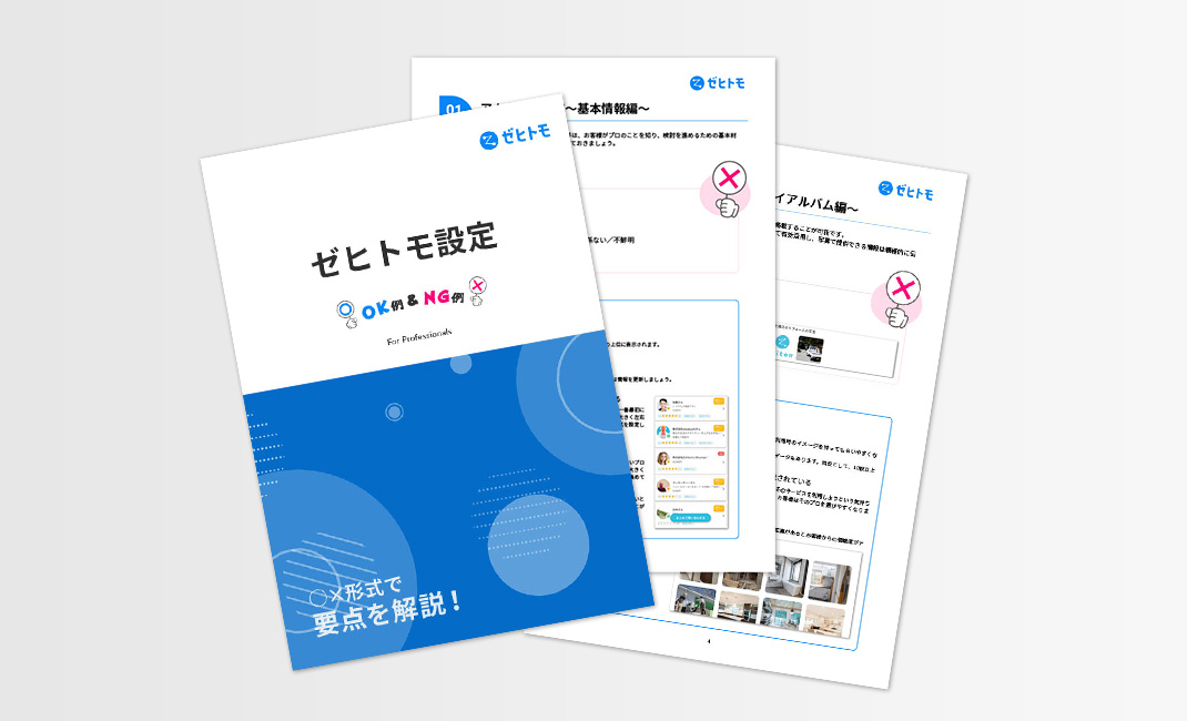 3分でわかるゼヒトモ 3分でわかるゼヒトモダウンロード 3ゼヒトモ設定 OK例&NG例ダウンロード 集客知識・トレンド WEB集客用語集ダウンロード 集客プラットフォーム導入チェックリストダウンロード 導入事例 成功事例集ダウンロード 住宅カテゴリー事業者向け 今から始める!工務店・リフォーム会社のWeb集客ダウンロード お仕事中のヒヤリハットエピソード集ダウンロード 「設定方法がわからない」 「どのような条件設定にすべき?」 といった疑問質問にお答えする個別相談会を無料で随時実施しております。 お気軽にお申し込みください! 無料個別相談会のご予約はこちら